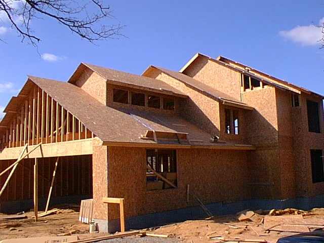 You can see the shape of the house better with sheathing and roof decking on. I love the roof lines. I'll have to remember to send our architect a Christmas card!!